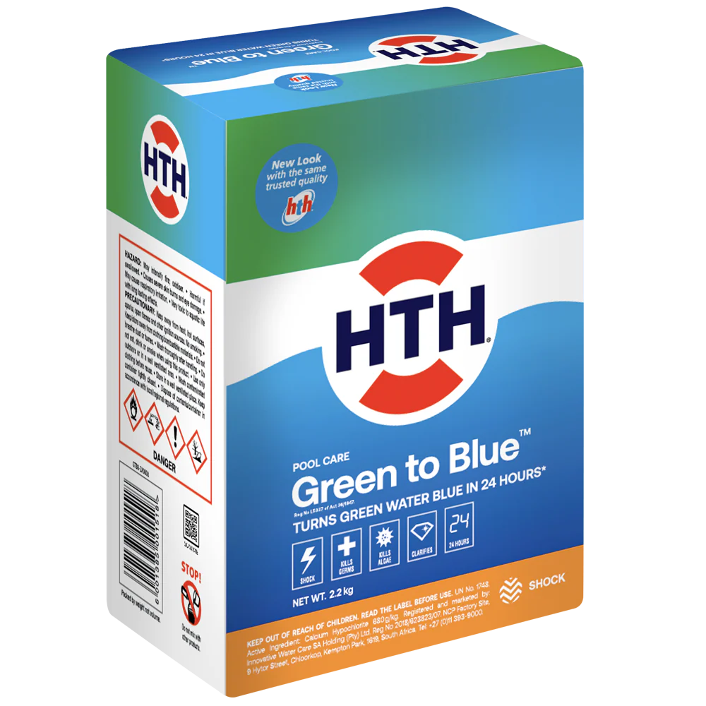 HTH Green to Blue turns green water blue in 24 hours provided that your pump and filter are in good working order and your stabiliser is operational. To explain how this wonderful product works is quite simple - chlorine performs two functions in our pool water. It kills harmful bacteria in the water and burns up dead organic matter.