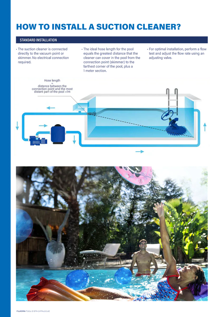 The ingenious deflector wheel virtually eliminates cleaning problems caused by severe angles and pool steps.